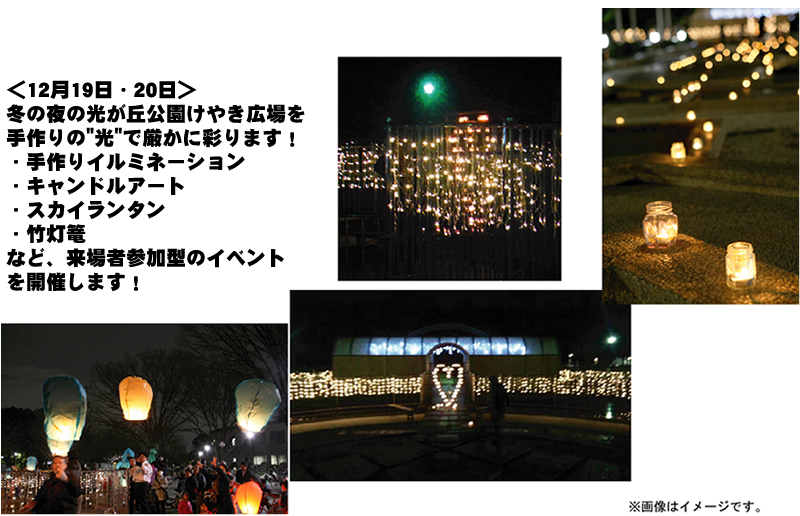 昼間は冬枯れの公園、夜は手作りイルミネーションや篝火・スカイランタン・キャンドルアート・竹灯篭を背景にコスプレ撮影をお楽しみいただけます!